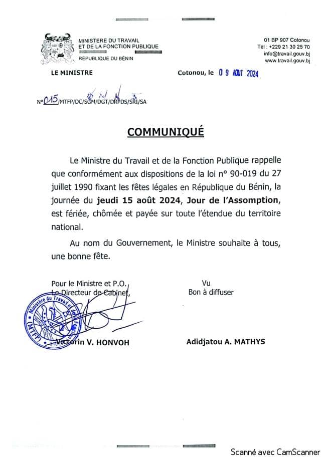 juillet 1990 fixant les fêtes légales en République du Bénin, la journée de l’Assomption, jeudi 15 août, est fériée, chômée et payée sur toute l’étendue du territoire national. Le Ministre du Travail et de la Fonction Publique l’a rappelé, hier vendredi 9 août, à travers un communiqué. Par la même occasion, le gouvernement a souhaité une bonne fête aux citoyens béninois. Toute l’équipe d’Oxygène Info Bénin souhaite bonne célébration de l’assomption aux fidèles chrétiens.