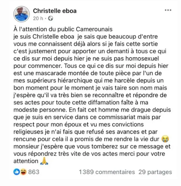 Depuis quelques jours au Cameroun, une série de vidéos intimes circulent sur les réseaux sociaux. On y voit une femme en tenue de police dans des postures pas très catholiques. A ces images, le nom de Christelle Eboa, une policière en service, a été associé. Face à l’ampleur du scandale, elle a fait une publication sur Facebook dans laquelle elle a donné sa version des faits.