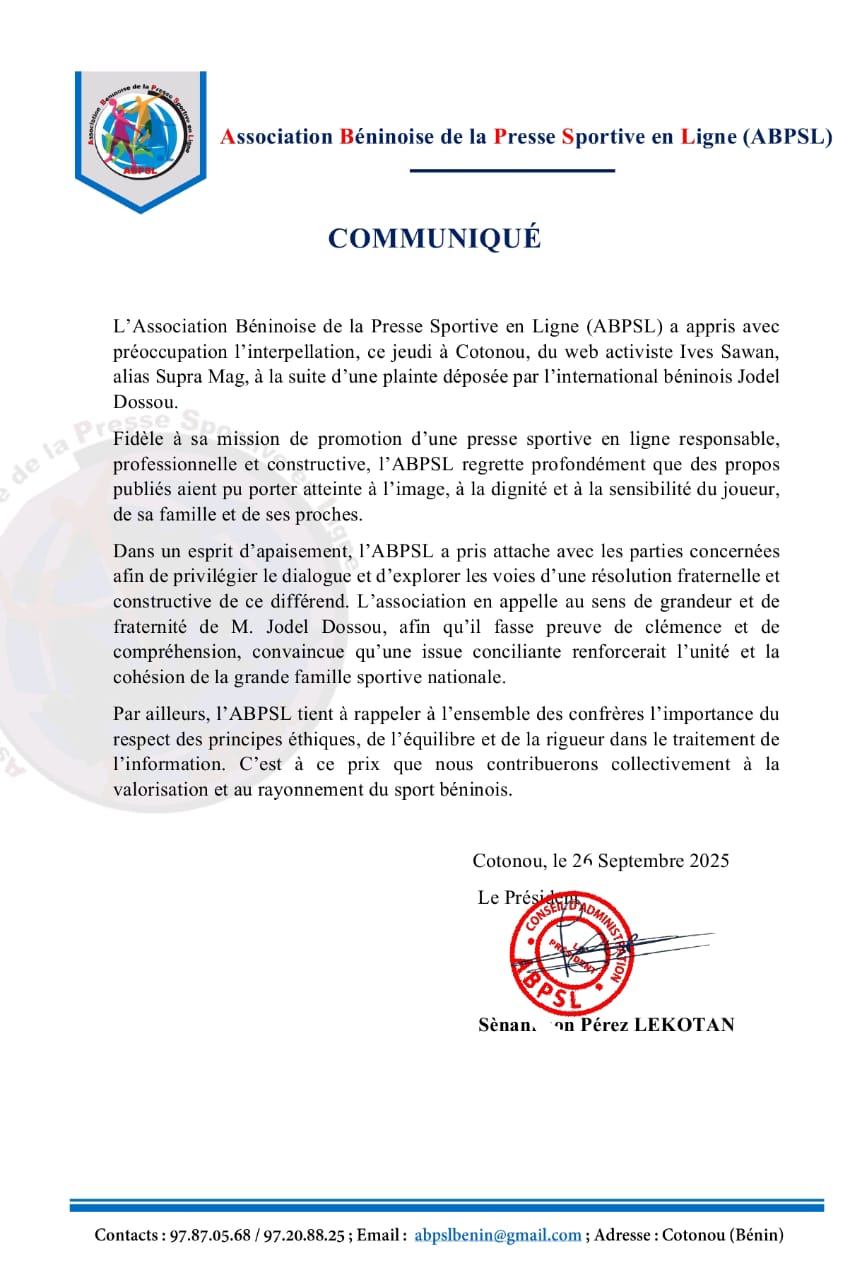 L’information a fait le tour des réseaux sociaux dans la soirée d’hier. Ives Sawan n’est plus libre de ses mouvements suite à une plainte de l’international Jodel Dossou. Dans la foulée, l’Association béninoise de la presse sportive en ligne (Abpsl) a fait sortir un communiqué dans lequel elle appelle à l’apaisement et au respect de l’éthique journalistique. Ci-dessous, le communiqué !