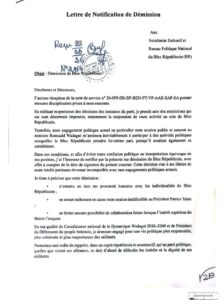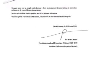 Bertin Koovi n’est plus membre du Bloc Républicain (BR). Il a annoncé sa démission à travers une lettre officielle en date du dimanche 22 février 2026, adressée au Secrétariat exécutif et au Bureau politique national du parti. Dans ce courrier intitulé « Lettre de Notification de Démission », l’ancien responsable du BR indique avoir pris acte d’une note de service portant mesures disciplinaires à son encontre, évoquant notamment la suspension de toute activité au sein du Bloc Républicain décidée par les instances du parti. Respectueux, dit-il, des décisions prises, Bertin Koovi explique cependant que son engagement politique actuel, en particulier son soutien public et assumé au ministre Romuald Wadagni, le conduit inévitablement à participer à des activités politiques auxquelles le Bloc Républicain pourrait également prendre part, celui-ci soutenant la même candidature, une situation qu’il juge susceptible d’entretenir la confusion. Afin d’éviter toute interprétation équivoque de sa position, il dit avoir l’honneur de notifier sa démission, avec effet à compter de la date de signature du courrier, précisant que cette décision vise à le libérer de toute tutelle partisane devenue incompatible avec ses engagements politiques actuels. Dans sa lettre, il prend soin de clarifier la portée de son départ, affirmant que sa démission n’entame en rien sa proximité humaine avec les individualités du Bloc Républicain, ne remet nullement en cause son soutien indéfectible au président Patrice Talon et ne ferme aucune possibilité de collaboration future si l’intérêt supérieur du Bénin l’exige. Se présentant comme Coordonnateur national de la Dynamique Wadagni 2026-2040 et président du Défensorat du peuple béninois, il réaffirme son engagement pour une vie politique plus responsable, plus cohérente et plus respectueuse des militants, rappelant au passage qu’un parti politique n’est pas un simple club électoral, mais un instrument de conviction, de protection militante et de consolidation démocratique qui doit avant tout défendre les intérêts et la dignité de ses militants.