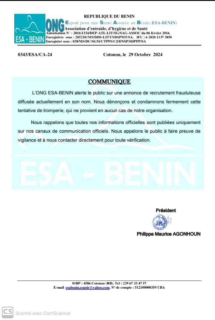 Ces pratiques sont typiques des arnaques en ligne, visant à exploiter les citoyens en leur demandant des informations sensibles. L’ONG ESA Bénin a réitéré que toutes ses annonces de recrutement sont diffusées uniquement via ses canaux officiels et sont toujours transparents.