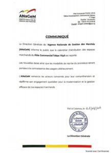 L’ANaGeM a annoncé le report du calendrier d’attribution des places initialement prévu. L’agence informe que le calendrier actualisé ainsi que les modalités de reprise du processus seront communiqués ultérieurement. L’ANaGeM réaffirme sa volonté de poursuivre la modernisation et la gestion efficace des espaces marchands pour le bénéfice de tous. La direction remercie l’ensemble des acteurs concernés pour leur patience et leur compréhension face à ce réajustement logistique.