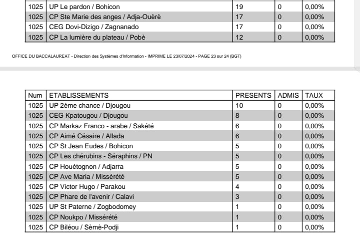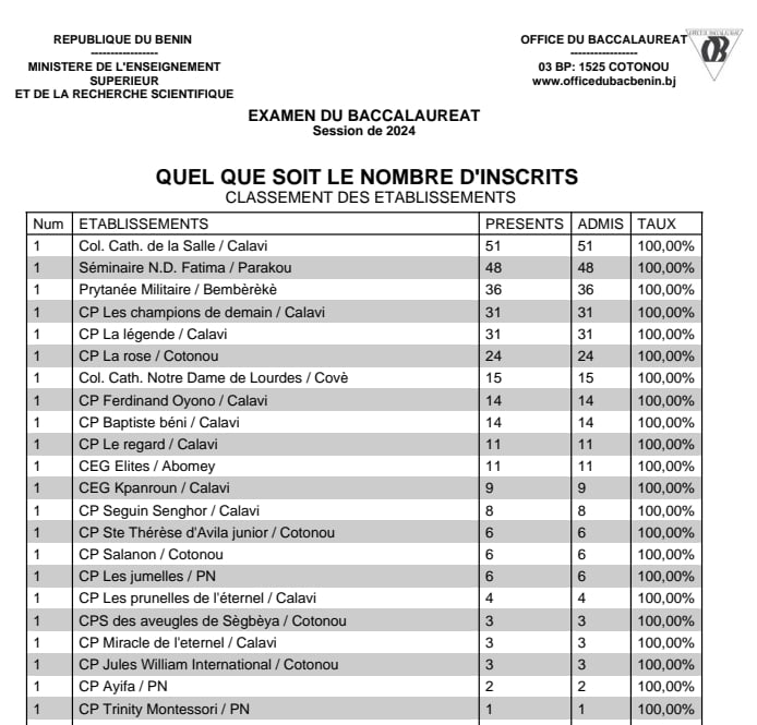 Ils sont au total 22 établissements qui ont atteint le seuil de 100% de réussite au baccalauréat, session de juin 2024. 17 autres ont donné 00%. Les performances de ces établissements s’observent bien par le nombre de candidats que chacun d’eux a présenté. Les listes ci-dessous.