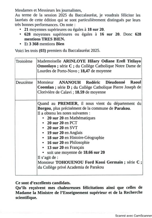 Le palmarès du Baccalauréat 2025 au Bénin a été dévoilé et c’est Monsieur TOHOUENOU Ford Kossi Germain qui occupe la première place ! Ce jeune surdoué originaire de Parakou a obtenu une moyenne de 18,66 sur 20 en série, une performance exceptionnelle qui force l’admiration. Élève du Collège Privé Academia de Parakou, il a su se démarquer par son travail acharné et sa détermination. Cette distinction est un motif de fierté pour son établissement et sa communauté. Le jeune major devient ainsi un exemple pour les élèves béninois, montrant que la réussite est à portée de main avec du travail et de la persévérance.
