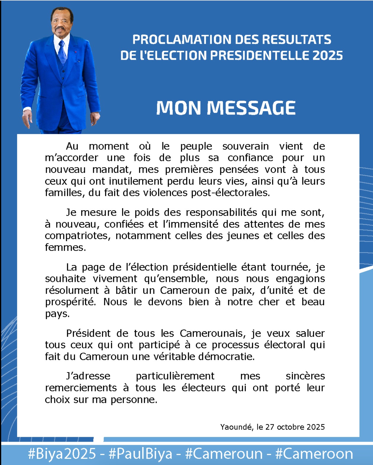 À l’issue de la proclamation officielle des résultats de l’élection présidentielle de 2025, Paul Biya, réélu pour un nouveau mandat, a adressé un message à la nation ce lundi 27 octobre 2025. Au début de son message, il a d’abord exprimé sa compassion envers les victimes des violences survenues après le scrutin. Conscient du lourd fardeau de ce nouveau mandat, il a souligné les attentes fortes des citoyens, en particulier celles des jeunes et des femmes. Appelant à tourner la page de l’élection, il a invité tous les camerounais à s’unir pour construire un pays apaisé, solidaire et prospère. Se présentant comme le président de tous les camerounais, il remercie chaleureusement tous ceux qui ont pris part au processus électoral qu’il considère comme une preuve de vitalité démocratique. Il a enfin remercié les électeurs qui lui ont renouvelé leur confiance avec la promesse de servir l’ensemble de la population avec dévouement.