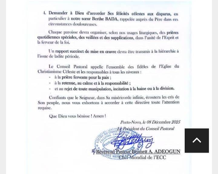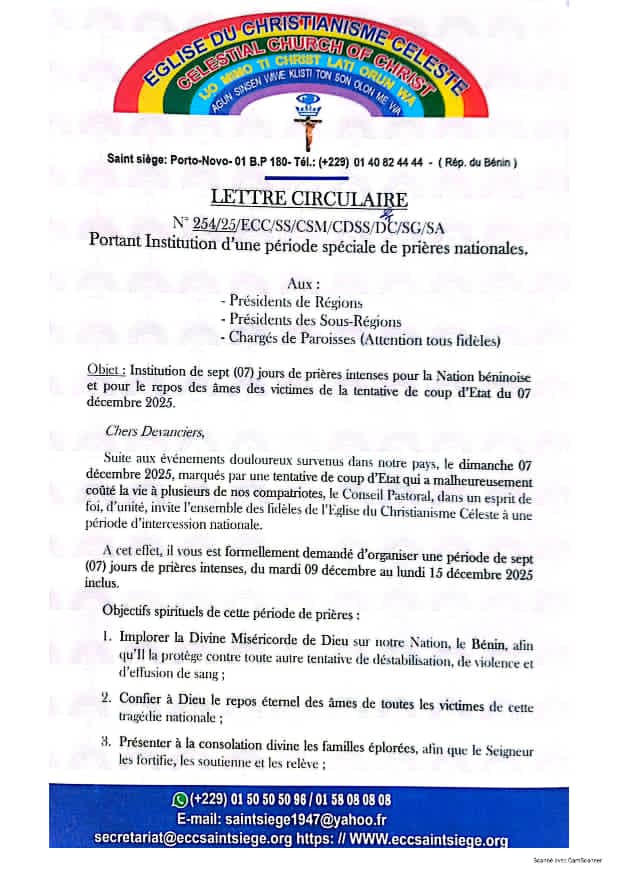 Au lendemain du coup d’État avorté du dimanche 7 décembre 2025, l’Église du Christianisme Céleste se positionne comme un pilier moral face au choc national. Profondément marquée par la tentative de renversement du pouvoir et par les vies fauchées lors de cette journée sombre, l’église lance un appel fort à l’endroit de ses fidèles : une semaine entière de prières intenses pour la Nation et pour le repos des victimes. Le Conseil Pastoral invite toutes les paroisses à organiser des veillées, des intercessions et des supplications quotidiennes, avec la conviction que le pays a besoin d’un souffle spirituel pour surmonter la peur, les tensions et l’incertitude. Les responsables ecclésiastiques rappellent que la mission de l’église dépasse les murs des temples, surtout lorsque la stabilité de la République vacille. Ils exhortent les croyants à la retenue, à la paix et à l’unité, insistant sur la nécessité de préserver la cohésion nationale au moment où les émotions restent vives. Cette décision de l’Église du Christianisme Céleste intervient alors que le pays panse encore ses plaies, tente de comprendre les ressorts de cette tentative de putsch et honore la mémoire des victimes, notamment celle de Berthe Bada, tuée par les mutins.