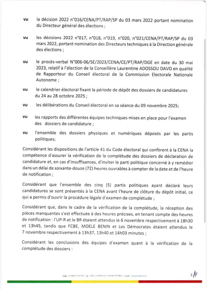 La Commission électorale nationale autonome (CENA) a rejeté les candidatures du parti Les Démocrates (LD) et de Moele-Bénin pour les élections communales du 11 janvier 2026. La décision a été rendue publique ce lundi 10 novembre 2025 et signée par le président Sacca Lafia.Le dossier de Moele-Bénin a été jugé incomplet. Les Démocrates ont fourni 353 documents sur 473 exigés, soit 120 pièces manquantes. Ces lacunes constituent des motifs légaux d’irrecevabilité selon la CENA. Par contre, les candidatures de l’Union Progressiste le Renouveau (UP-R), du Bloc Républicain (BR) et des Forces Cauris pour un Bénin Émergent (FCBE) ont été validées pour le scrutin.