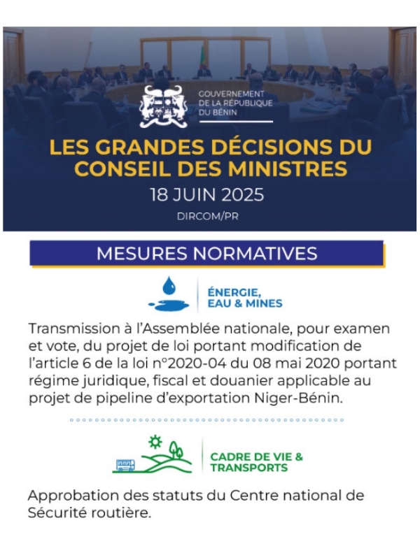 Le Conseil des ministres s’est tenu ce mercredi 18 juin 2025 au Palais de la Marina sous la présidence du Chef de l’État, Patrice Talon. Cette réunion hebdomadaire a permis au gouvernement de prendre plusieurs décisions dans divers secteurs de la vie nationale. Voici les grandes décisions.