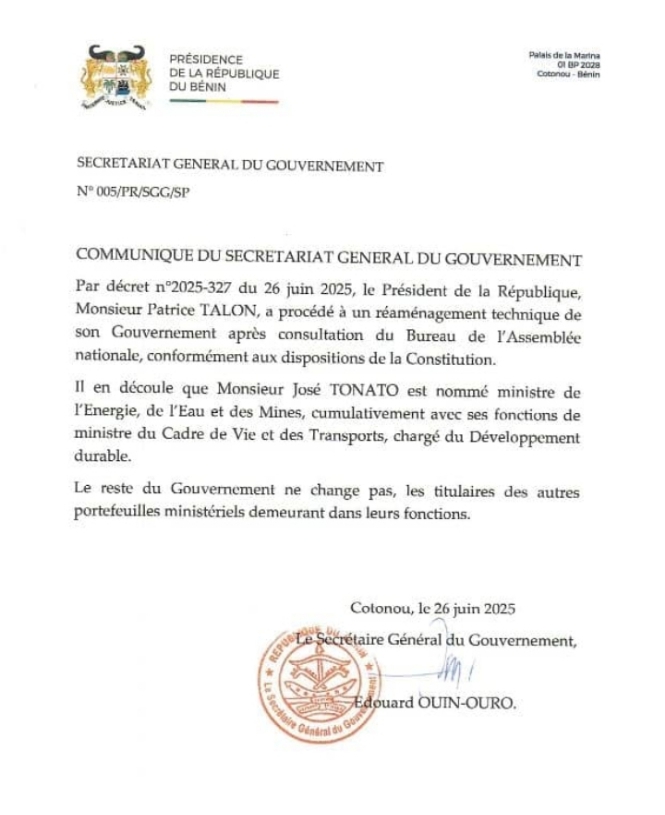 C’est désormais confirmé! Le ministre de l’Énergie, de l’Eau et des Mines, Paulin Akponna, a été relevé de ses fonctions. C’est ce qu’on retenir dans un communiqué émis par le secrétaire général du gouvernement en date de ce jeudi 26 juin 2025 . José Didier Tonato lui succède et assume ce portefeuille ministériell avec ses fonctions actuelles. Cette décision fait suite à la demande du président de la République qui a sollicité l’avis consultatif du bureau de l’Assemblée nationale pour ce changement. Un avis favorable a été émis.