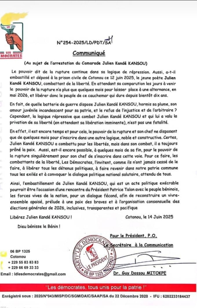 Arrêté à son domicile à Abomey-Calavi le jeudi 5 juin, Julien Kandé KANSOU a été placé en garde à vue avant d’être entendu par la Cour de répression des infractions économiques et du terrorisme (Criet) le jeudi 12 Juin 2025. Il séjourne à la prison civile de Cotonou. Face à cette situation, son parti, Les Démocrates, a réagi par le biais de son service de communication. Le parti de l’ancien président Boni Yayi a exprimé son désaccord et appelle le gouvernement en place à libérer les détenus politiques, à faire revenir les exilés et à organiser un dialogue politique national.