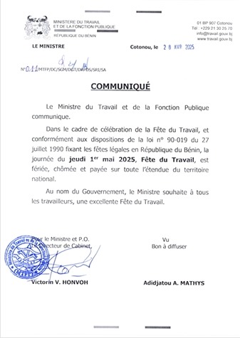 La journée du jeudi 1er mai 2025 déclarée fériée, chômée et payée. C’est dans un communiquée en date du 28 avril que la ministre du Travail et de la Fonction Publique porte l’information à la connaissance du public. Cette décision intervient dans le cadre de la célébration de la fête du Travail et conformément aux dispositions de la loi nº 90-019 du 27