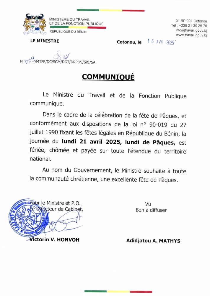 Dans un communiqué en date du 16 Avril 2025, le gouvernement béninois par l’intermédiaire du ministère du Travail et de la Fonction Publique, a annoncé que la journée du lundi 21 Avril 2025 est fériée, chômée et payée sur toute l’étendue du territoire national. Par cette même occasion, le ministre souhaite une excellente célébration à toute la communauté chrétienne qui s’apprête à célébrer la résurrection du Christ.