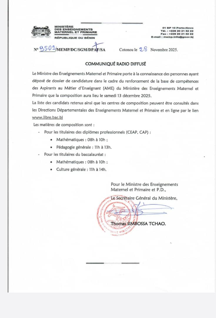 Les candidats ayant postulé pour intégrer la base de compétences des Aspirants au Métier d’Enseignant (AME) au sein du Ministère des Enseignements Maternel et Primaire ont désormais une date officielle pour passer leurs épreuves. Selon le communiqué rendu public, la composition se tiendra le samedi 13 décembre 2025. Le Ministère précise que la liste des candidats retenus ainsi que les centres de composition sont disponibles dans les Directions Départementales des Enseignements Maternel et Primaire. Un accès en ligne est également prévu via le lien www.libre.bac.bj pour faciliter la consultation. Les épreuves ont été clairement définies en fonction des diplômes des candidats. Pour les titulaires de diplômes professionnels tels que le CEAP ou le CAP, les épreuves porteront sur Mathématiques de 08h à 10h et sur Pédagogie générale de 11h à 13h. Les candidats détenteurs du baccalauréat composeront en Mathématiques de 08h à 10h et en Culture générale de 11h à 14h.