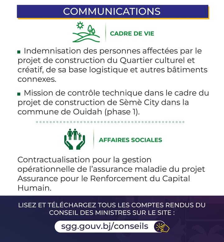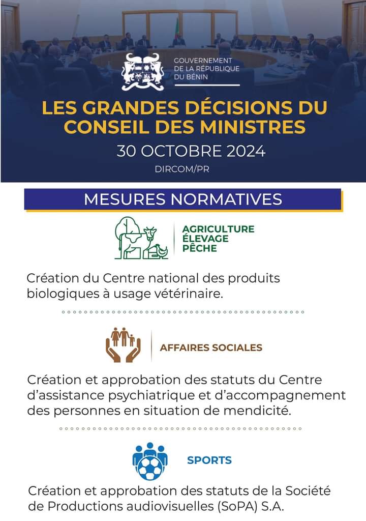 Bénin : les grandes décisions du Conseil des ministres de ce mercredi 30 octobre Politique 30/10/2024 Martin HOUNKPELeave a Comment on Bénin : les grandes décisions du Conseil des ministres de ce mercredi 30 octobre 1 045 Le Conseil des ministres du gouvernement du Bénin s’est tenu ce mercredi 30 octobre 2024. Voici ci-dessous le récapitulatif des grandes décisions à connaître.