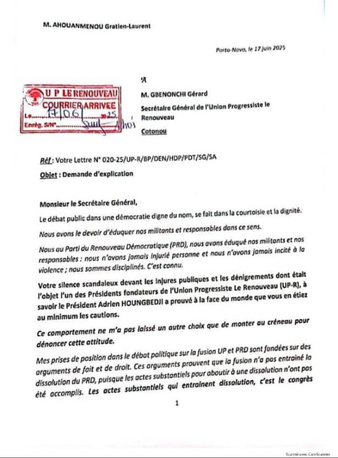 Gratien Ahouanmenou, cadre du parti ex PRD, a adressé une réponse à Gérard Gbénonchi, secrétaire général du parti l’Union Progressiste Le Renouveau. Cette réponse fait suite à une demande d’explications qui lui avait été adressée à la suite de ses récentes interventions médiatiques. Dans une lettre datée du lundi 16 juin 2025, il précise que ses déclarations n’ont en aucun cas été injurieuses, diffamatoires ou incitatrices à la violence. Il reproche au contraire à certains responsables de l’UP Le Renouveau d’avoir laissé prospérer, dans un silence complice, des propos publics dénigrant les fondateurs du parti, notamment le président Adrien Houngbédji. Par ailleurs, concernant la fusion entre le PRD et l’UP, M. Ahouanmenou affirme que les conditions juridiques et statutaires nécessaires à une dissolution effective du PRD ne sont pas réunies. C’est pourquoi, il revendique son appartenance au parti PRD.