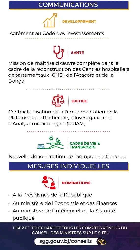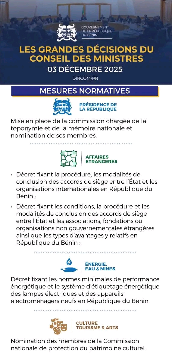 Bénin : voici les grandes décisions du conseil des ministres de ce mercredi 03 décembre 2025 Actualités 03/12/2025 Martin HOUNKPELeave a Comment on Bénin : voici les grandes décisions du conseil des ministres de ce mercredi 03 décembre 2025 20Le conseil des ministres s’est réuni ce mercredi 03 décembre 2025 sous la présidence du Chef de l’État, chef du gouvernement Patrice Talon. À l’occasion plusieurs décisions ont été prises dont voici les grandes lignes.