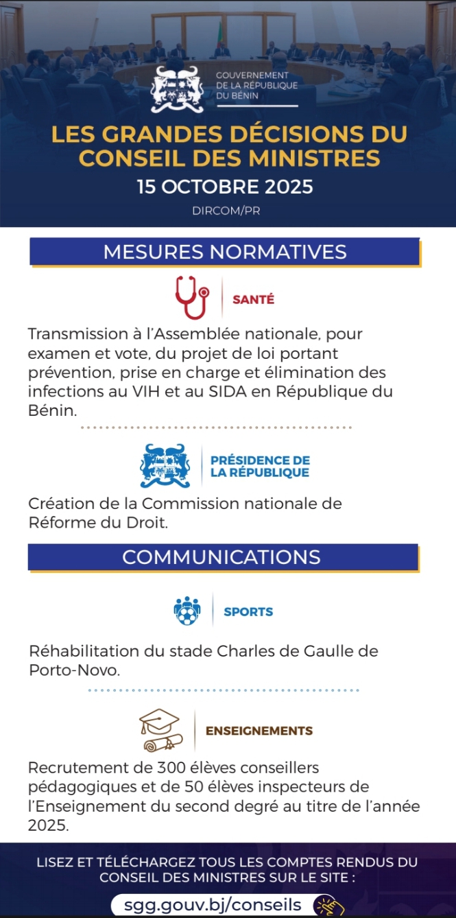 Bénin: Voici les grandes lignes du conseil des ministres de ce mercredi 15 octobre 2025 15 octobre 2025 0 Actualités Le Conseil des Ministres du Bénin s’est réuni ce mercredi 15 octobre 2025 sous la présidence du Président Patrice Talon. Plusieurs décisions importantes ont été prises lors de cette séance. Voici les grandes lignes : PARTAGER CET ARTICLE SUR Conseil des ministres de ce mercredi 15 octobre 2025les grandes décisions