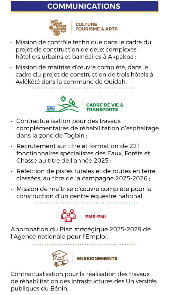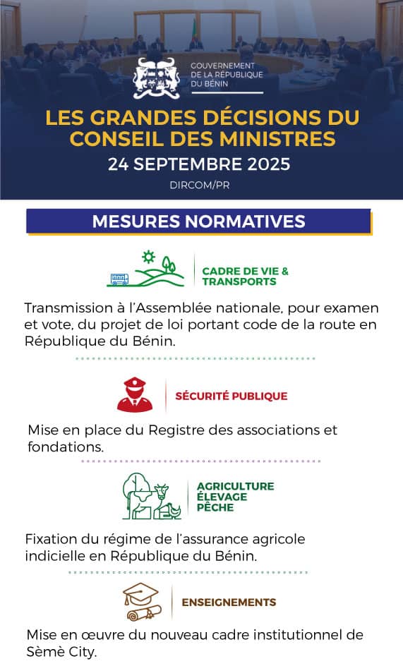 Bénin: Voici les grandes lignes du conseil des ministres de ce mercredi 24 septembre 2025 Redaction La 24 septembre 2025 0 Actualités 9 Le Conseil des Ministres du Bénin s’est réuni ce mercredi 24 septembre 2025 sous la présidence du Président Patrice Talon. Plusieurs décisions importantes ont été prises lors de cette séance. Voici les grandes lignes : PARTAGER CET ARTICLE SUR Bénin: Voici les grandes lignes du conseil des ministres de ce mercredi 24 septembre 2025