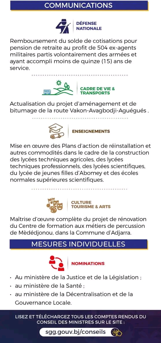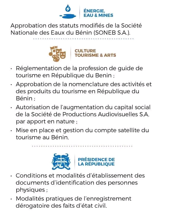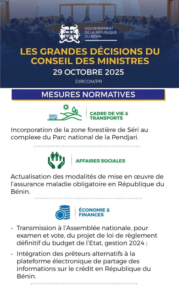 Bénin: Voici les grandes lignes du conseil des ministres de ce mercredi 29 octobre 2025 Actualités 29/10/2025 Martin HOUNKPELeave a Comment on Bénin: Voici les grandes lignes du conseil des ministres de ce mercredi 29 octobre 2025 271Le Conseil des Ministres du Bénin s’est réuni ce mercredi 29 octobre 2025 sous la présidence du Président Patrice Talon. Plusieurs décisions importantes ont été prises lors de cette séance. Voici les grandes lignes :
