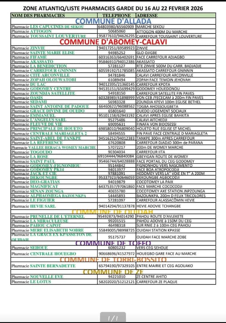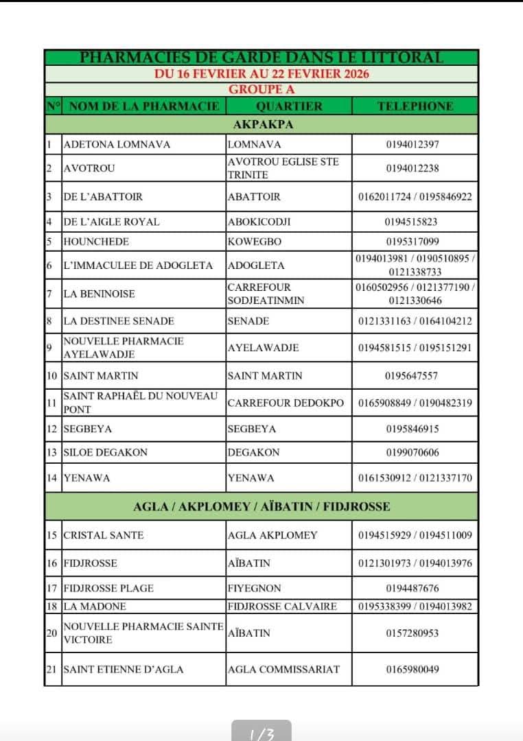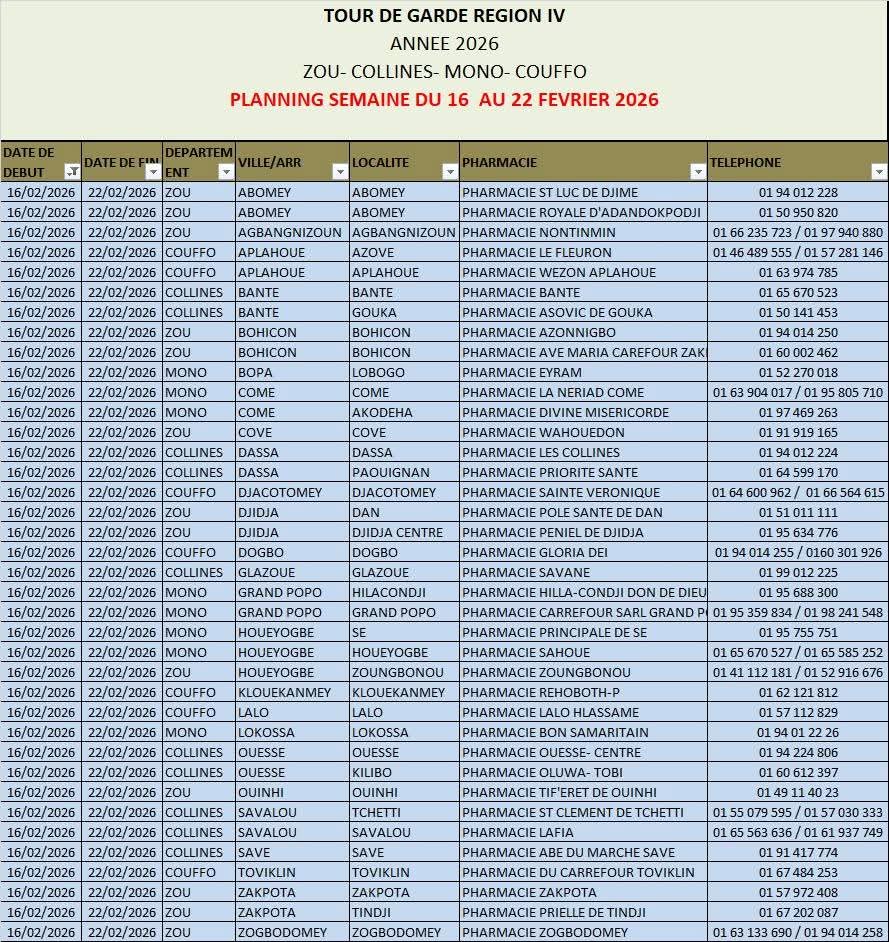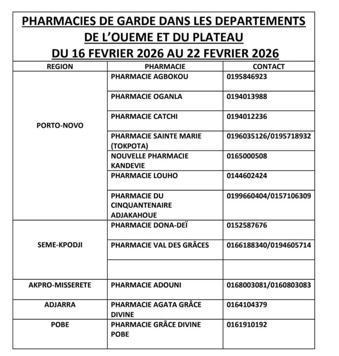 Afin d’assurer la continuité des soins et de garantir l’accès aux médicaments en dehors des heures habituelles d’ouverture, les pharmacies du Bénin assureront des permanences de garde du lundi 16 au dimanche 22 février 2026 sur l’ensemble du territoire national.