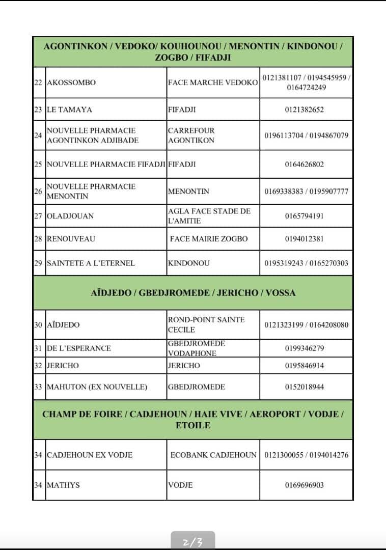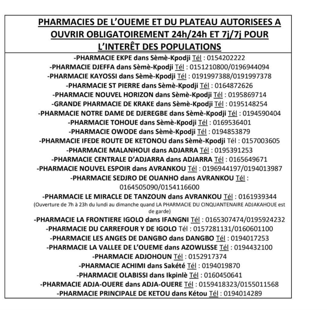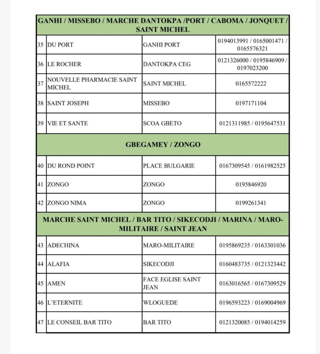 Dans les grandes agglomérations comme Cotonou, Porto-Novo, Parakou, Abomey-Calavi ou encore Bohicon et autres, des officines ont été désignées pour assurer un service continu 24h/24 selon le planning établi. Voici la liste: