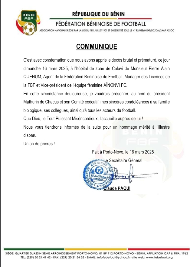 Dans un communiqué officiel, la FBF a exprimé ses plus sincères condoléances à la famille du football béninois, qui a perdu l’un de ses plus précieux membres. Elle a également adressé ses pensées émues à la famille biologique d’Alain Quenum en ces moments de grande douleur.