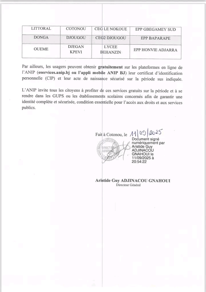 A l’occasion de la célébration de la Journée internationale de l’Identité, l’Agence nationale d’identification des personnes (ANIP) a annoncé la gratuité de plusieurs de ses services. Du 13 au 16 septembre 2025, les citoyens pourront bénéficier de ces services dans les Guichets uniques de protection sociale (GUPS) et dans certains établissements scolaires et collèges sélectionnés.