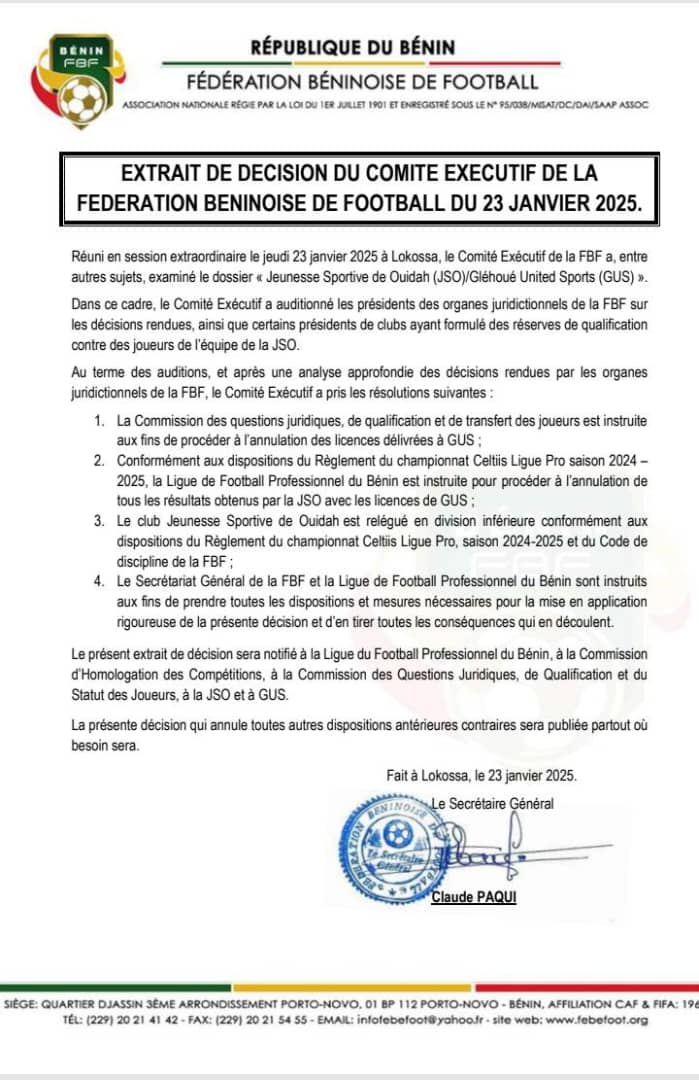 Le deuxième club de la cité des Kpassè dans l’élite du football national a été épinglé par le Comité exécutif de la FBF. En effet, réuni en Assemblée générale ordinaire le jeudi 23 janvier 2025 à Lokossa, le Comité exécutif de la Fédération béninoise de football a examiné entre autres, le dossier relatif à la Jeunesse Sportive de Ouidah (JSO). Au terme des auditions et après une analyse approfondie des décisions rendues par les organes juridictionnelles de la FBF, le Comité exécutif n’est pas allé de main morte vis-à-vis de la JSO. Le club a été relégué en division inférieure. Ci-dessous, l’extrait des décisions.