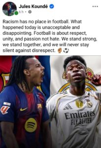 De son côté, le joueur de Barcelone, Jules Kounde, a également exprimé son soutien à Vinicius Jr. Il dénonce avec fermeté le racisme et appele à l’unité et au respect dans le football. «Le racisme n’a pas sa place dans le football. Ce qui s’est passé aujourd’hui est inacceptable et décevant. Le football, c’est le respect, l’unité et la passion, pas la haine», a-t-il écrit sur les réseaux sociaux.