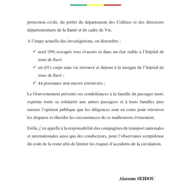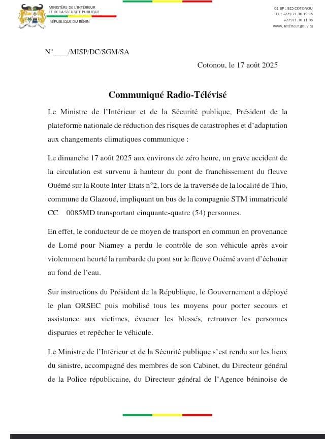 Dans un communiqué en date de ce dimanche 17 août 2025, le gouvernement béninois a donné un peu plus de détails sur l’accident tragique survenu sur l’axe Glazoué-Savè, où un autocar a chuté dans le fleuve Ouémé. Selon le ministre de l’Intérieur, Alassane SEIDOU, le bilan provisoire fait état de 9 rescapés, d’un corps retrouvé et de 44 personnes portées disparues. Les opérations de recherche et de repêchage se poursuivent, précise le communiqué.