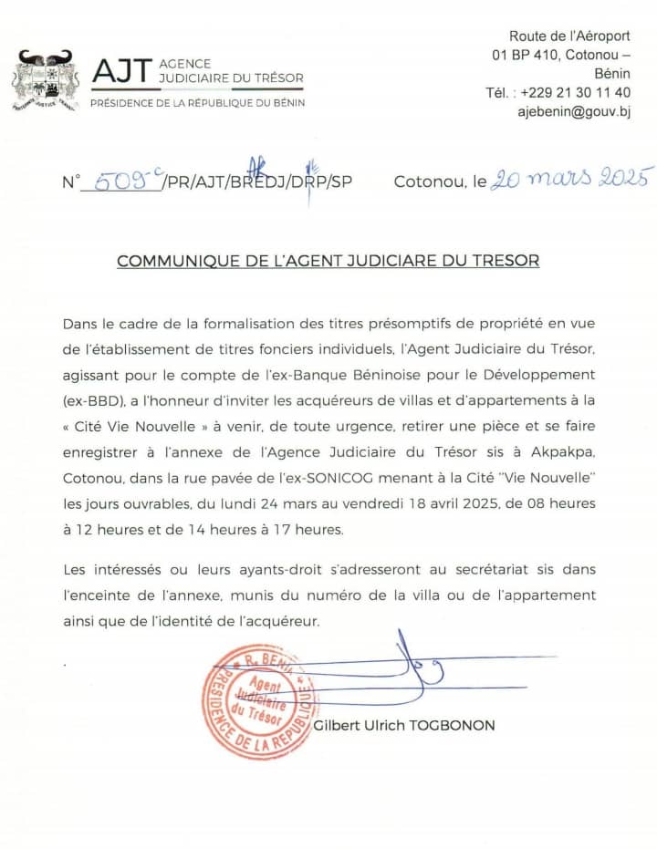Dans un communiqué en date du 20 février 2025, l’Agent Judiciaire du Trésor, agissant pour le compte de l’ex-Banque Béninoise pour le Développement (ex-BBD), invite d’inviter les acquéreurs de villas et d’appartements à la « Cité Vie Nouvelle » à venir, de toute urgence, retirer une pièce et se faire enregistrer.