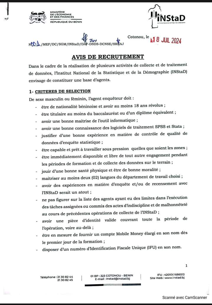 Collecte et traitement de données sur le terrain: L’INStaD, ex-INSAE lance un recrutement pour constituer une base d’agents