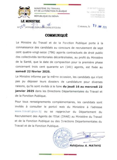 Les candidats au concours de recrutement au profit du ministère de la Santé seront en composition le samedi 22 février 2025. C’est à travers un communiqué en date du 13 janvier que le ministre du Travail et de la Fonction Publique porté l’information à la connaissance des candidats. Cette date concerne une première phase de 341 agents.