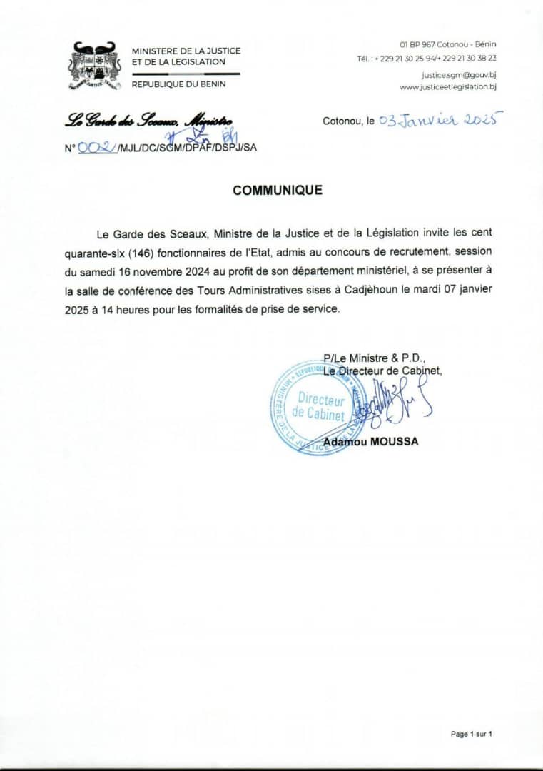 Le Ministère de la Justice et de la Législation du Bénin accueille 146 nouveaux fonctionnaires, recrutés lors du concours du 16 novembre 2024. Ces agents, désormais intégrés au département ministériel, sont invités à se rendre ce mardi 7 janvier 2025, à 14 heures, dans la salle de conférence des Tours Administratives de Cadjèhoun pour remplir les formalités de leur prise de fonction. Cette étape marque le début de leur engagement au service de la justice et des citoyens.