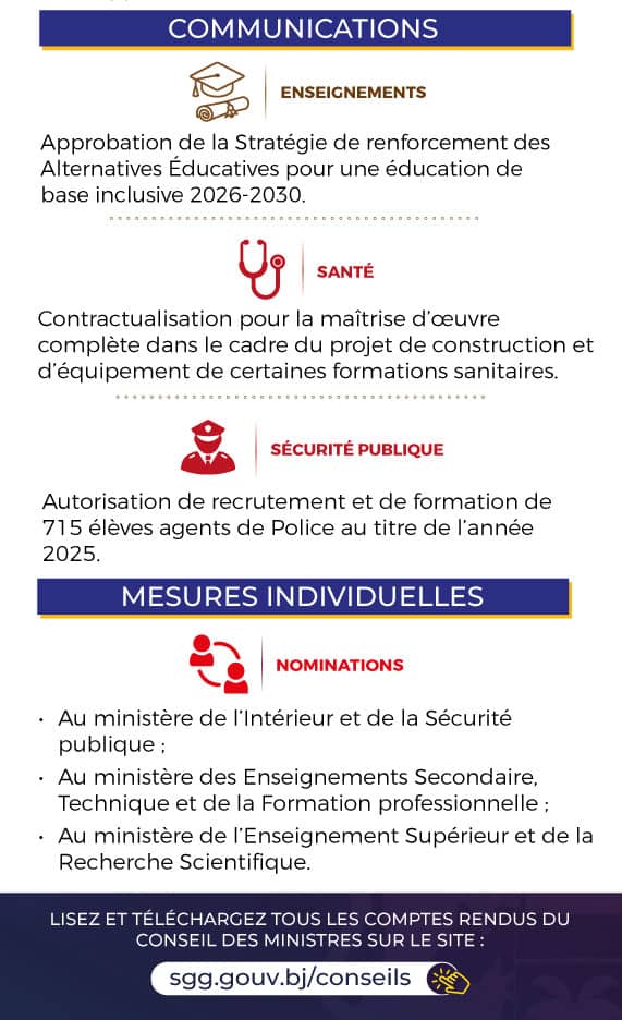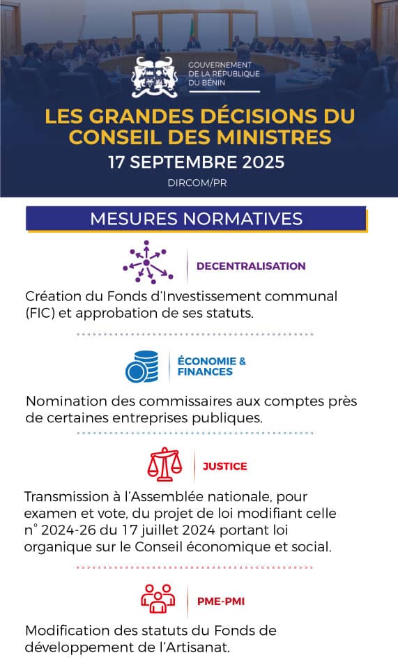 Le conseil des ministres s’est réuni, ce mercredi 17 septembre 2025, sous la présidence de Monsieur Patrice TALON, Président de la République, Chef de l’État, Chef du Gouvernement. À l’issue de la réunion, plusieurs décisions ont été prises. Voici les grandes lignes :
