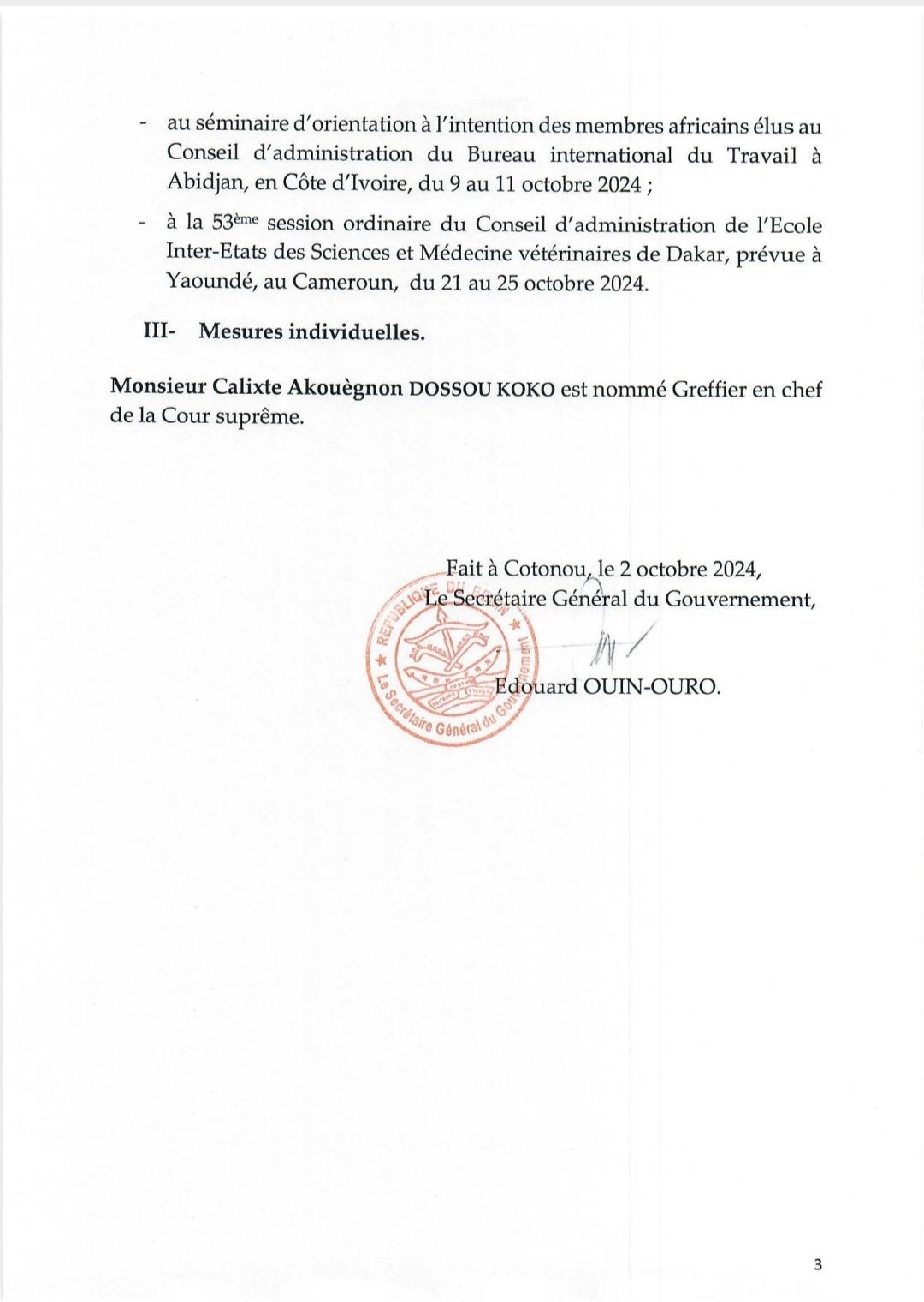 En Conseil des Ministres de ce mercredi, 02 octobre 2024, plusieurs décisions ont été prises. Au point des mesures individuelles, le gouvernement a nommé le Greffier en chef à la Cour Suprême.