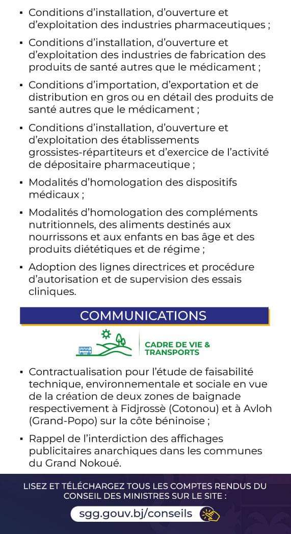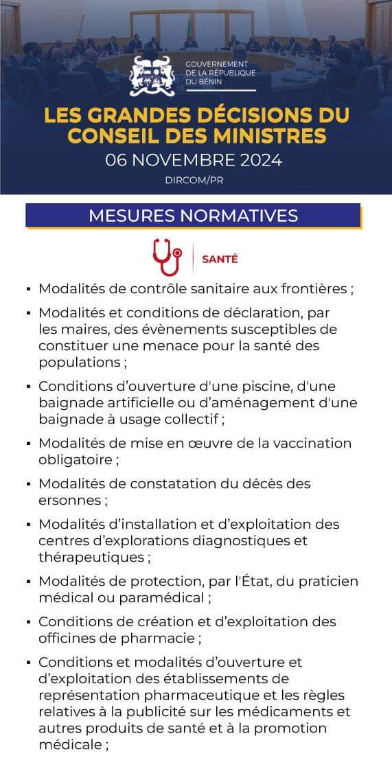 Au Palais de la Marina de Cotonou, le Conseil des ministres a eu lieu ce mercredi 5 novembre 2024. Voici pour vous le récapitulatif des grandes décisions du Conseil en attendant le compte rendu détaillé.