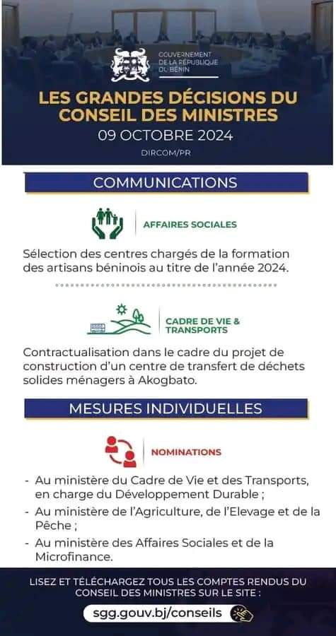 Conseil des Ministres: les grandes décisions de ce mercredi 09 octobre 2024 Politique 09/10/202409/10/2024 Martin HOUNKPELeave a Comment on Conseil des Ministres: les grandes décisions de ce mercredi 09 octobre 2024 1 205Le Gouvernement s’est réuni en Conseil des Ministres ce mercredi 09 octobre 2024, sous la présidence du chef de l’État, Patrice Talon. Plusieurs décisions ont été prises dont voici les grands points.