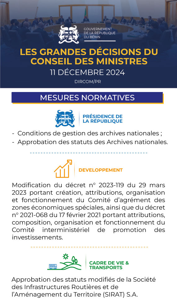 Conseil des Ministres: Voici les grandes décisions de ce 11 décembre 2024 Politique 11/12/202411/12/2024 Martin HOUNKPELeave a Comment on Conseil des Ministres: Voici les grandes décisions de ce 11 décembre 2024 1 155Le gouvernement a tenu ce 11 décembre 2024 son rendez-vous hebdomadaire du Conseil des Ministres. D’importantes décisions ont été prises dont voici les grands points.