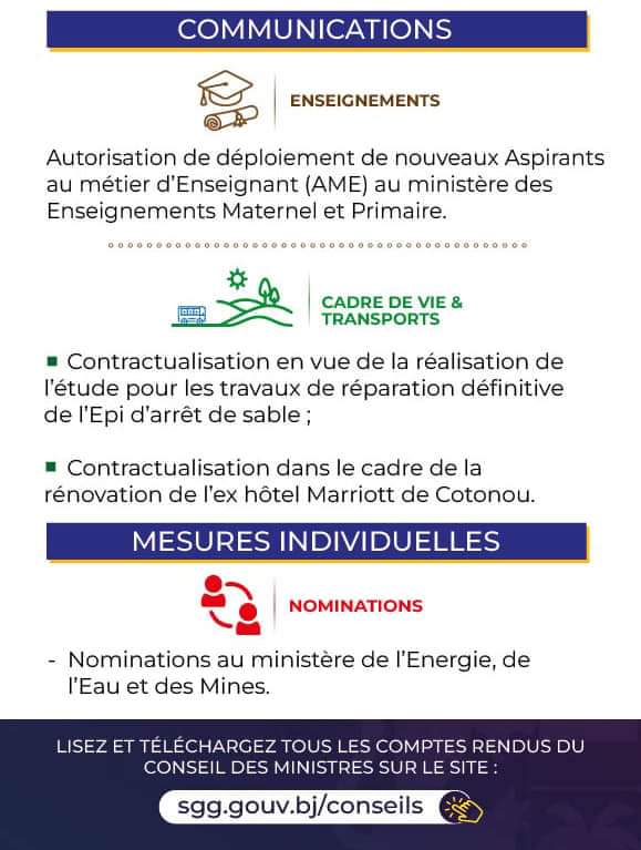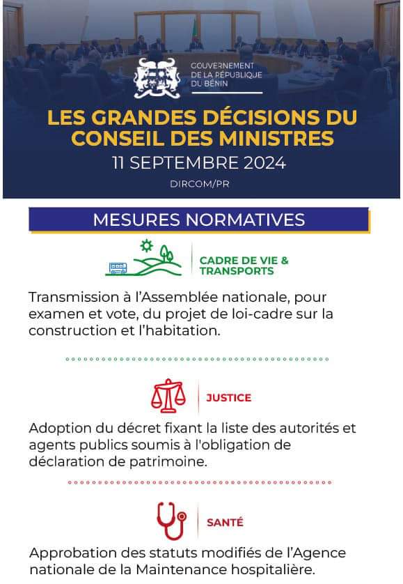 Conseil des Ministres: Voici les grandes décisions de ce mercredi 11 septembre 2024 Politique 11/09/2024 Martin HOUNKPELeave a Comment on Conseil des Ministres: Voici les grandes décisions de ce mercredi 11 septembre 2024 1 094Le Gouvernement s’est réuni en Conseil des Ministres ce mercredi 11 septembre 2024. Voici les grandes décisions issues de la rencontre.