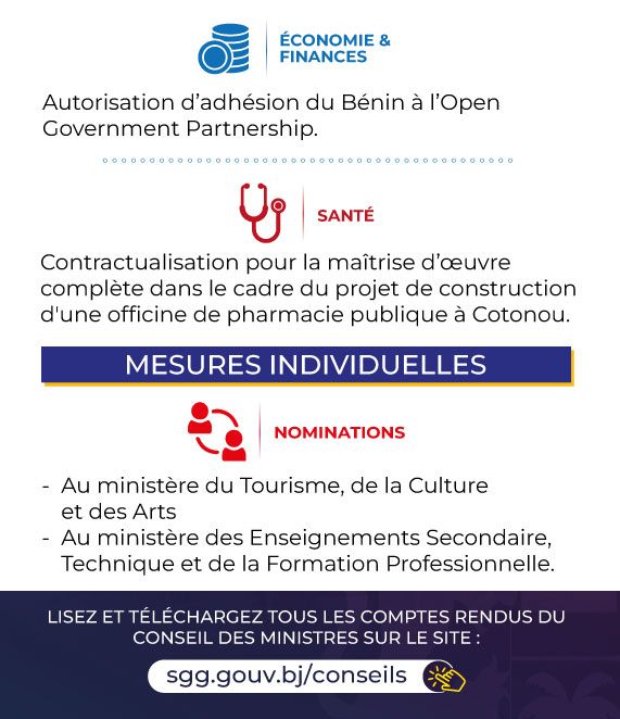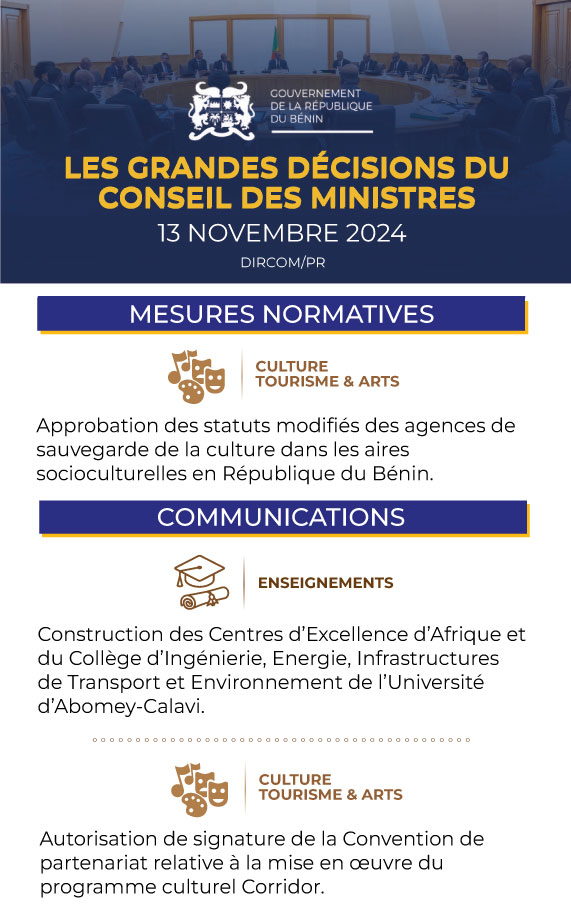 Conseil des Ministres: voici les grandes décisions de ce mercredi 13 novembre 2024 Politique 13/11/202413/11/2024 Martin HOUNKPELeave a Comment on Conseil des Ministres: voici les grandes décisions de ce mercredi 13 novembre 2024 1 578 Le gouvernement s’est réuni en Conseil des Ministres ce mercredi 13 novembre 2024. Au cours de la rencontre, plusieurs suejts ont été scrutés avec la prise d’importantes décisions.