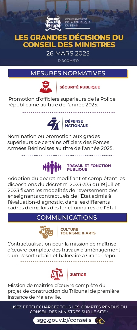 Conseil des ministres: voici toutes les grandes décisions de ce mercredi 26 mars 2025 Politique 26/03/202526/03/2025 Martin HOUNKPELeave a Comment on Conseil des ministres: voici toutes les grandes décisions de ce mercredi 26 mars 2025 1 389En conseil des ministres ce jour, 26 mars 2025, le gouvernement a pris plusieurs décisions. Voici les grands points ci-dessous.