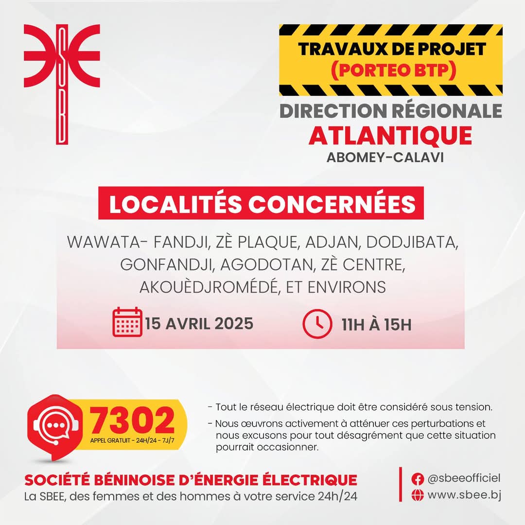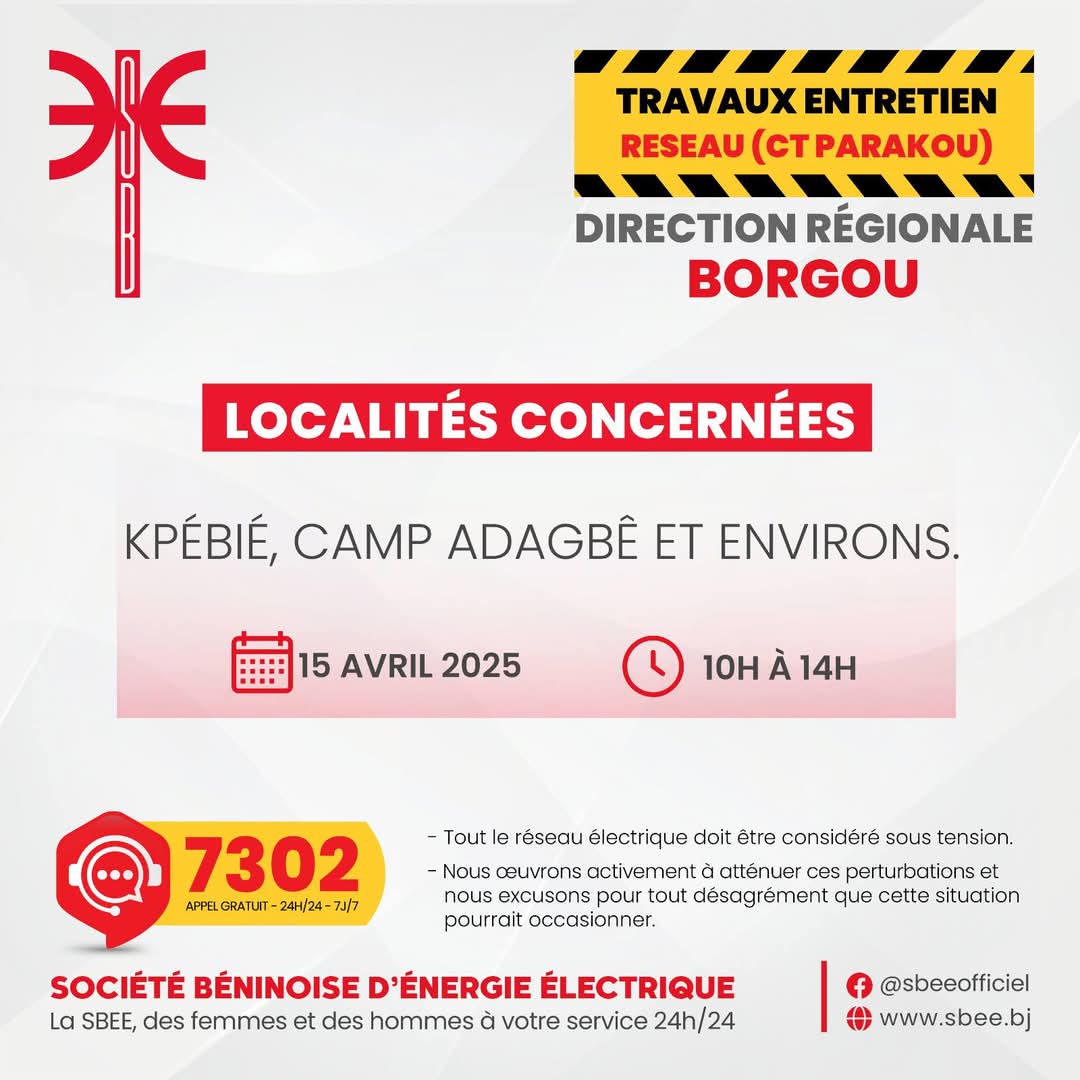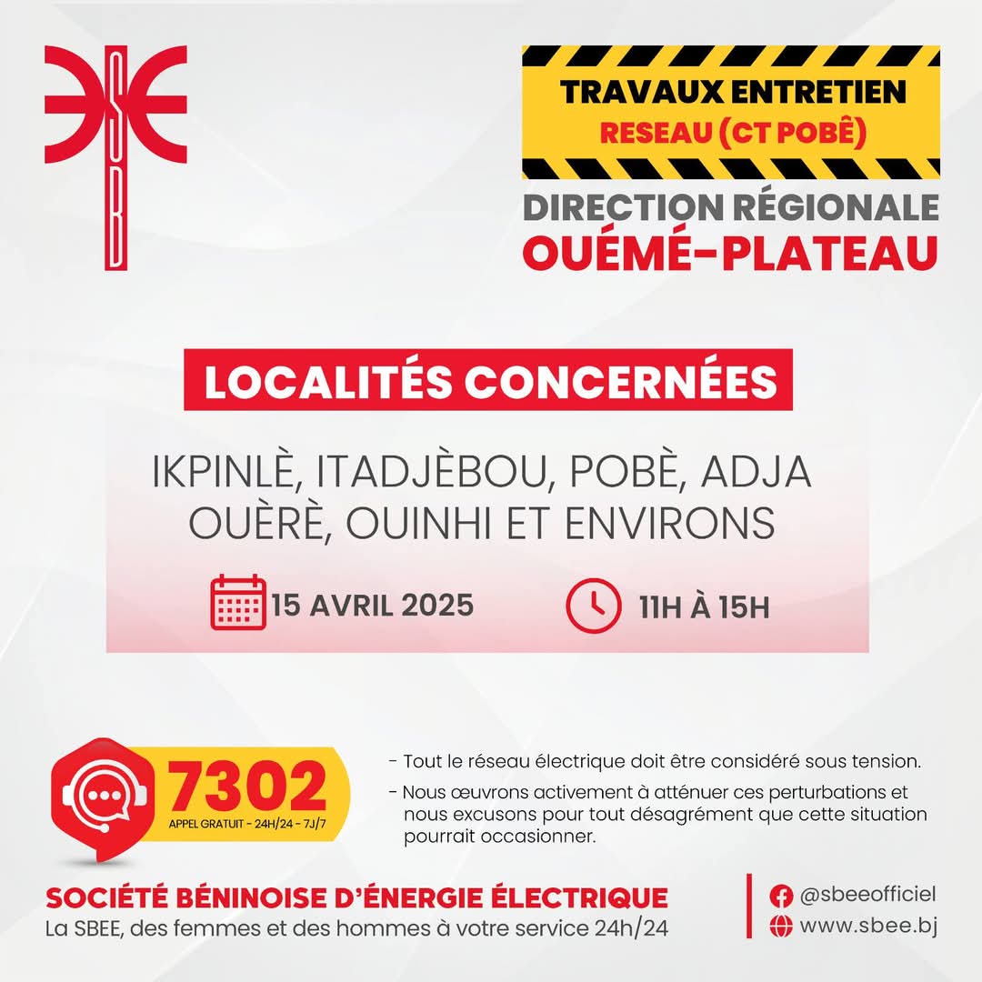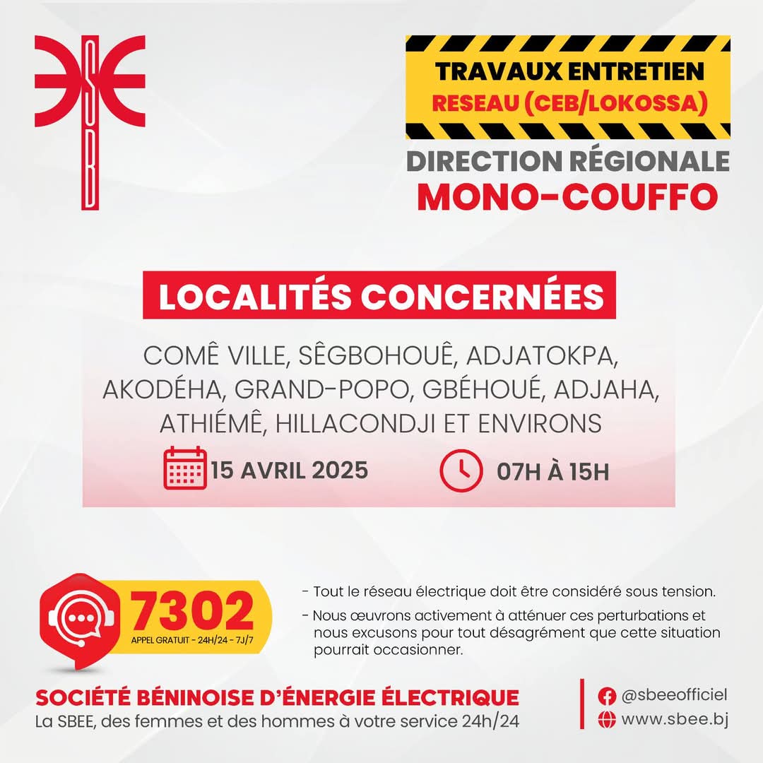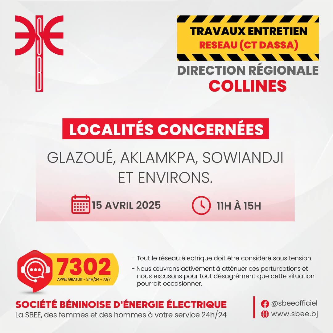 La Société Béninoise d’Énergie Électrique, dans ses travaux de maintenance , a annoncé des perturbations dans plusieurs localités du pays. Les habitants des zones ciblées devraient s’y préparer pour éviter tout désagrément. C’est toujours dans la volonté de mieux satisfaire sa clientèle que la SBEE mène ces travaux périodiques sur ses installations.