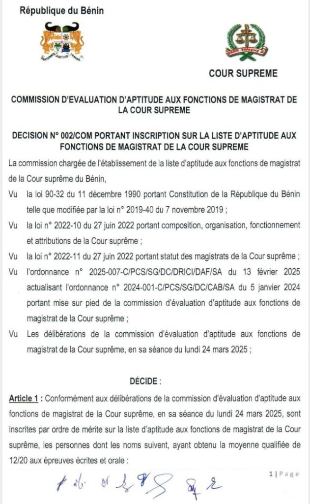 L’intégralité de la décision n°002/Com portant inscription sur la liste d’aptitude aux fonctions de magistrat de la Cour suprême.