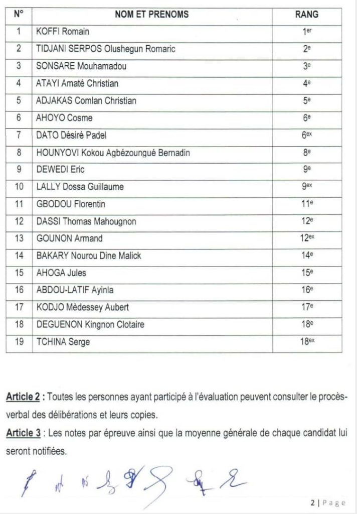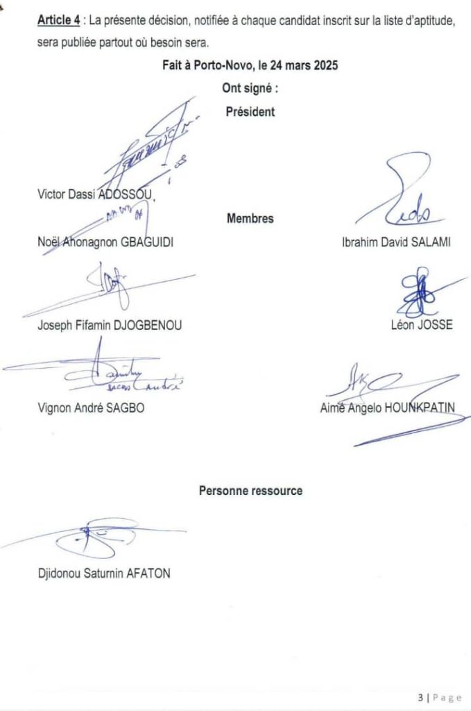 La Commission d’évaluation d’aptitude aux fonctions de magistrat de la Cour Suprême a rendu public, a l’issue de sa délibération de ce 24 mars 2025, la liste d’aptitude aux fonctions de magistrat de la Cour Suprême. Au total 19 personnes sur 42 ont été retenues à la fin du deuxième test organisé le lundi 10 mars 2025 au siège de la Haute juridiction à Porto-Novo. Ces dernières ont obtenu la moyenne qualifiée de 12/20 dans les deux épreuves (écrites et orale).