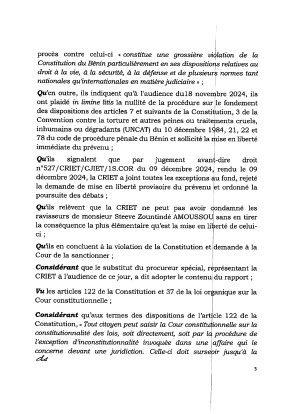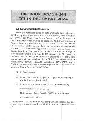 La Cour Constitutionnelle a rejeté un recours émis par les avocats de Steeve Amoussou. En effet, sur la base des conditions de son interpellation et de sa détention provisoire, les avocats de Steeve Amoussou ont formé un recours à la Cour Constitutionnelle. La requête en date du 18 décembre 2024, demandait la déclaration de la nullité de la procédure et la relaxe de Steeve Amoussou.