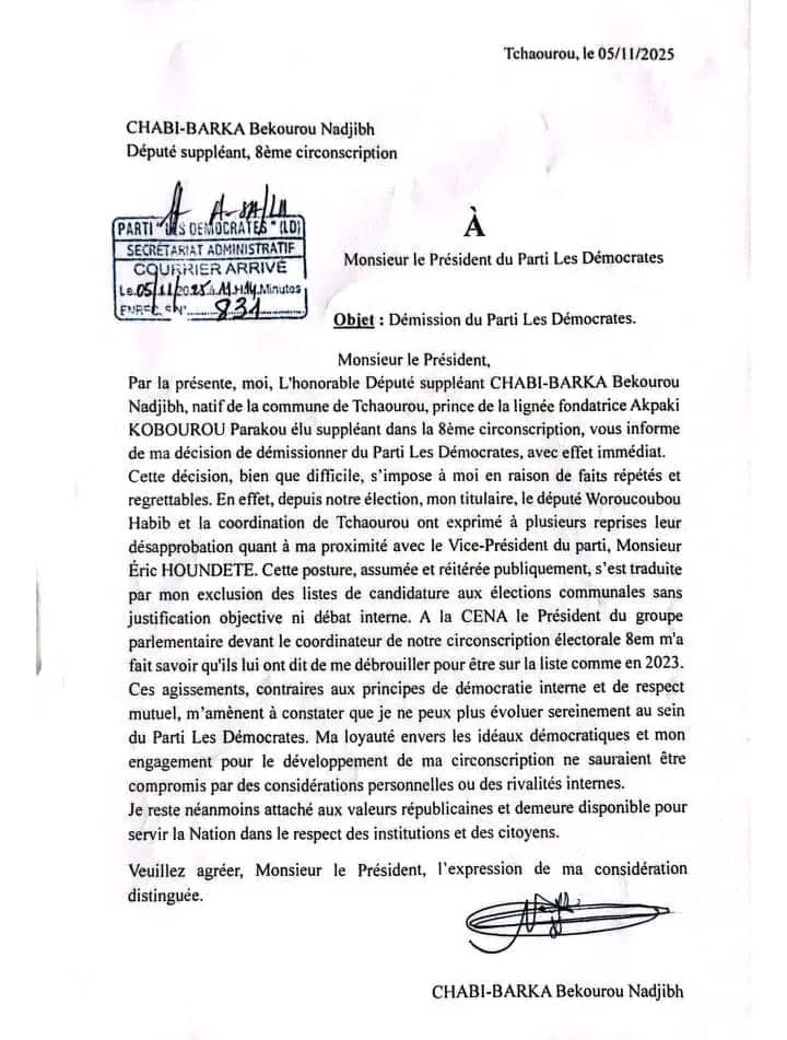 Coup dur pour le parti d’opposition Les Démocrates. Le député suppléant CHABI-BARKA Nadjibh a annoncé sa démission ce mardi 5 novembre 2025. Dans sa lettre adressée à la direction du parti, il évoque des « agissements contraires aux principes de démocratie interne » et dénonce les pressions liées à sa proximité avec Éric HOUNDÉTÉ.