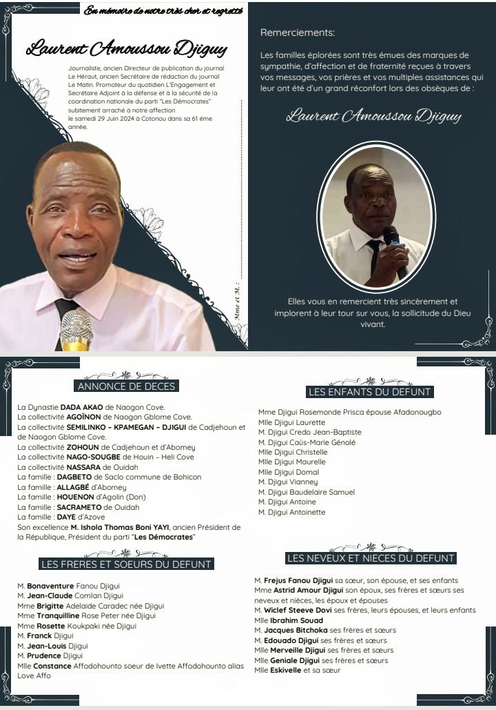 Rappelé à Dieu le 29 juin 2024 dans sa 61è année, le journaliste Laurent Amoussou DJIGUY sera conduit dans sa dernière demeure le samedi 27 juillet 2024 au cimetière d’Adjagbo.