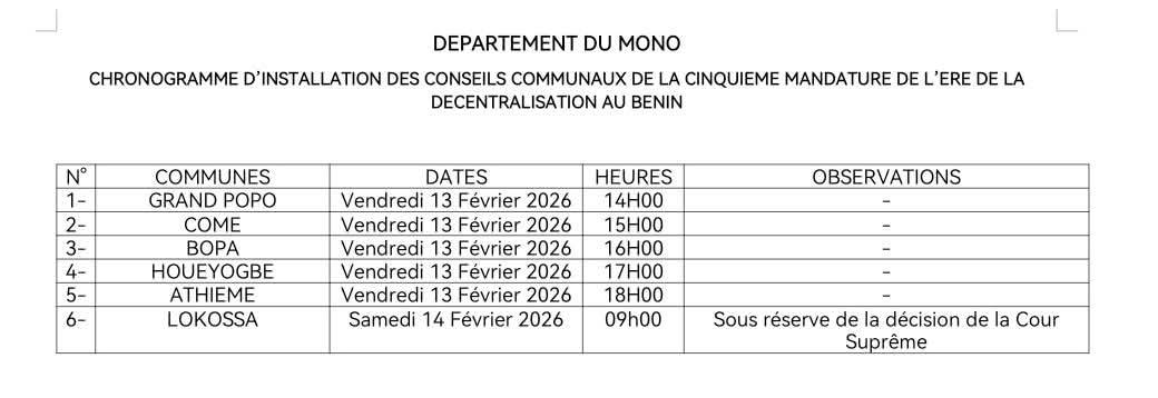 Département du Mono: le programme complet de l’installation des Conseils communaux