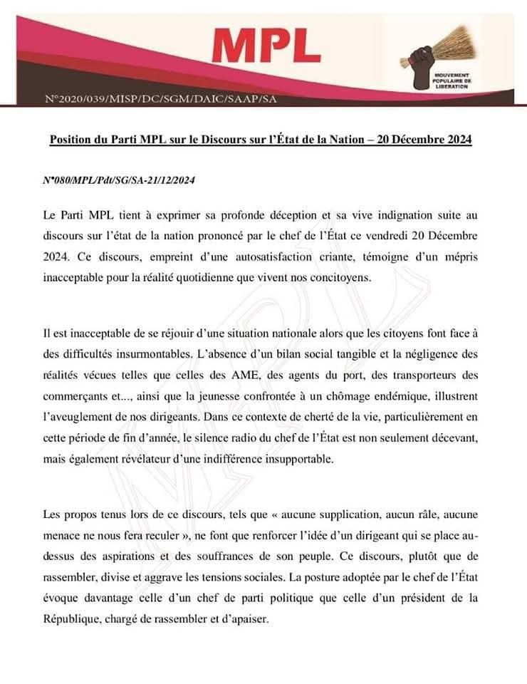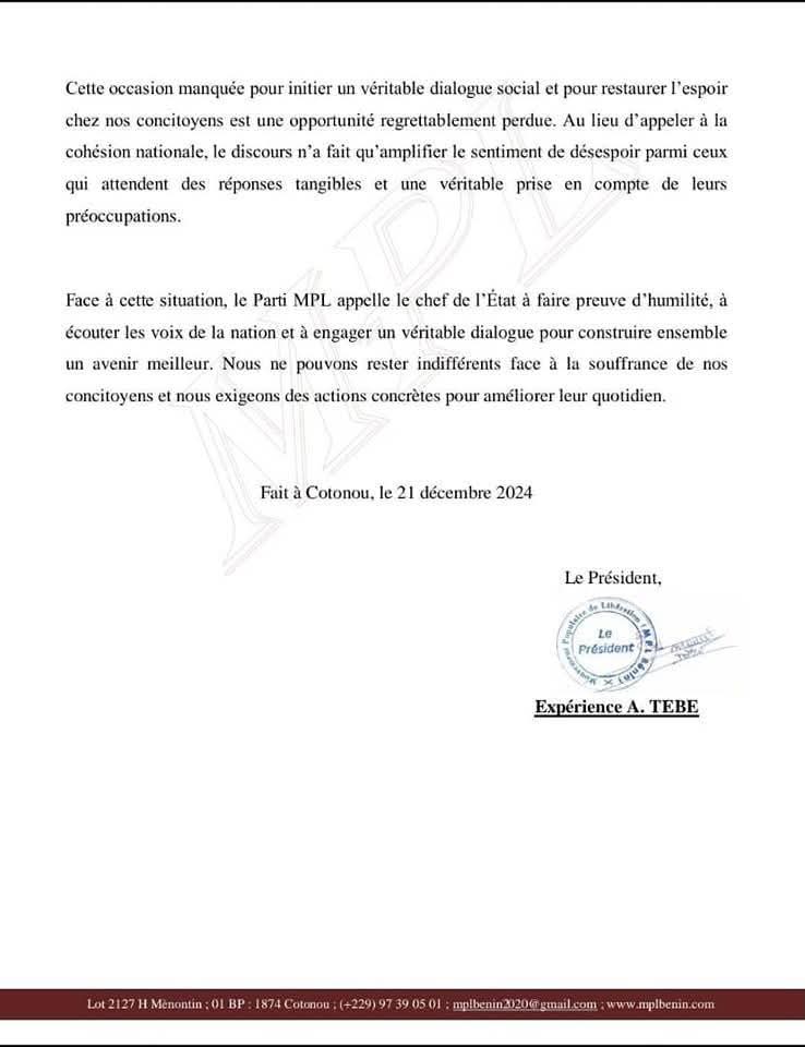 Le président Patrice Talon a tenu ce vendredi 20 décembre 2024 devant les députés, son discours sur l’état de la nation. A travers une note, le parti MPL a exprimé sa profonde déception et sa vive indignation suite à ce discours prononcé.